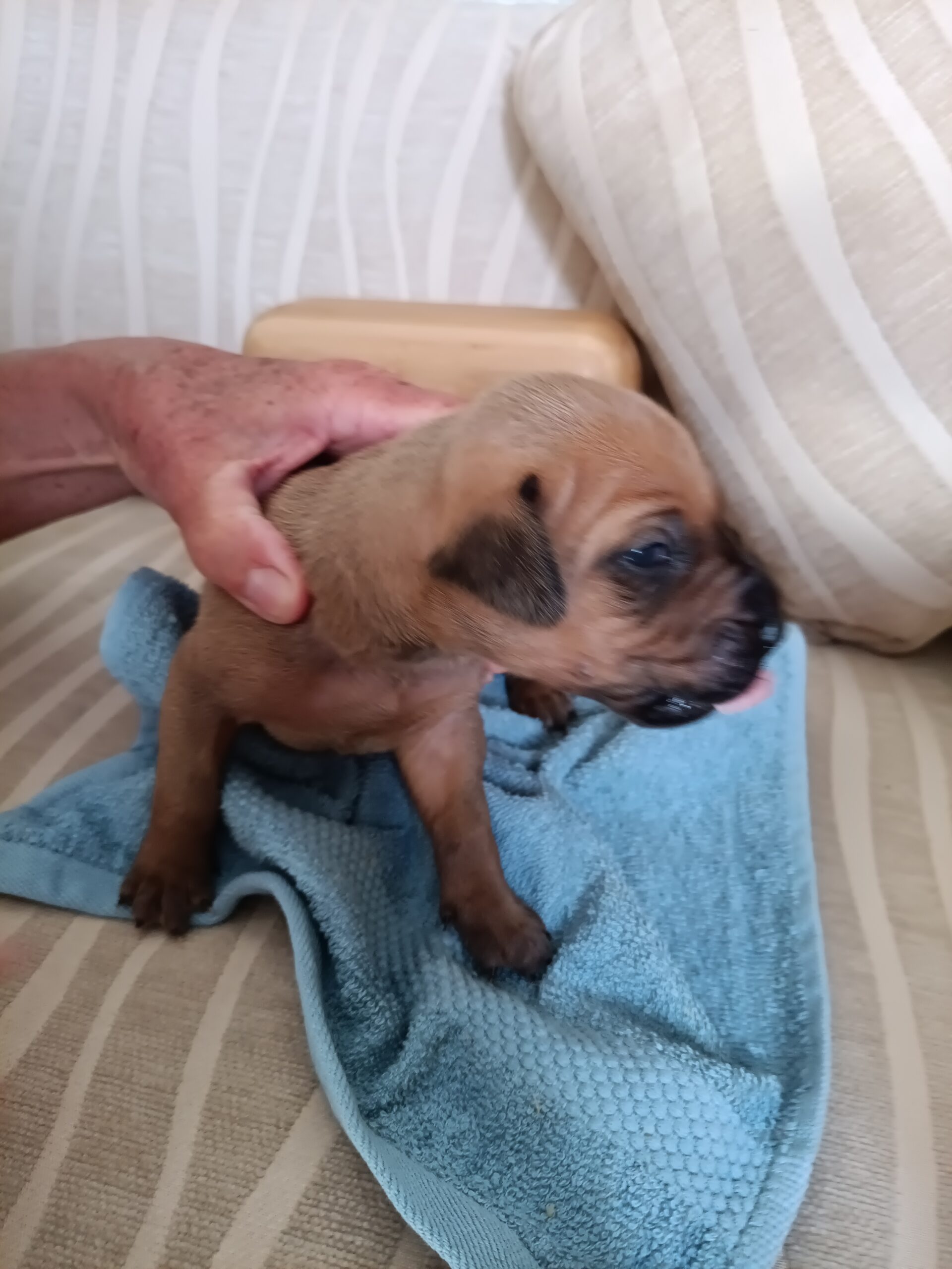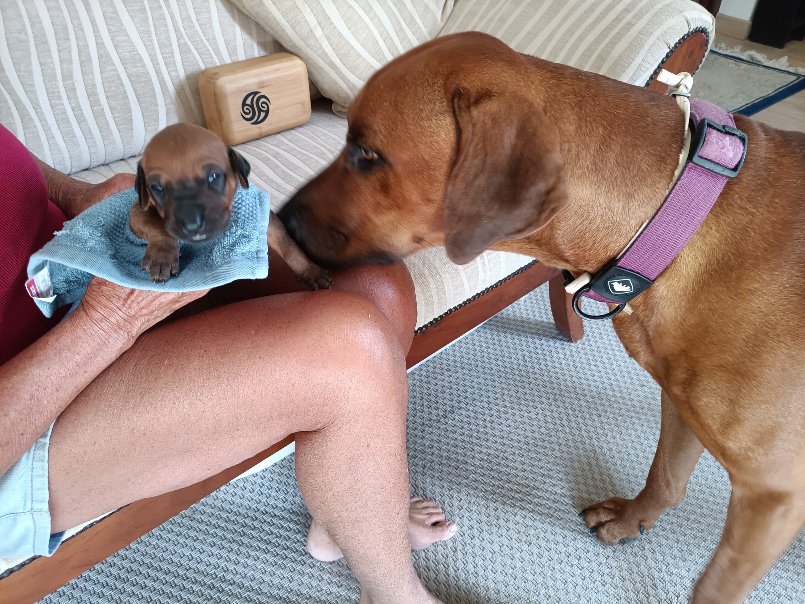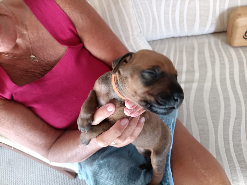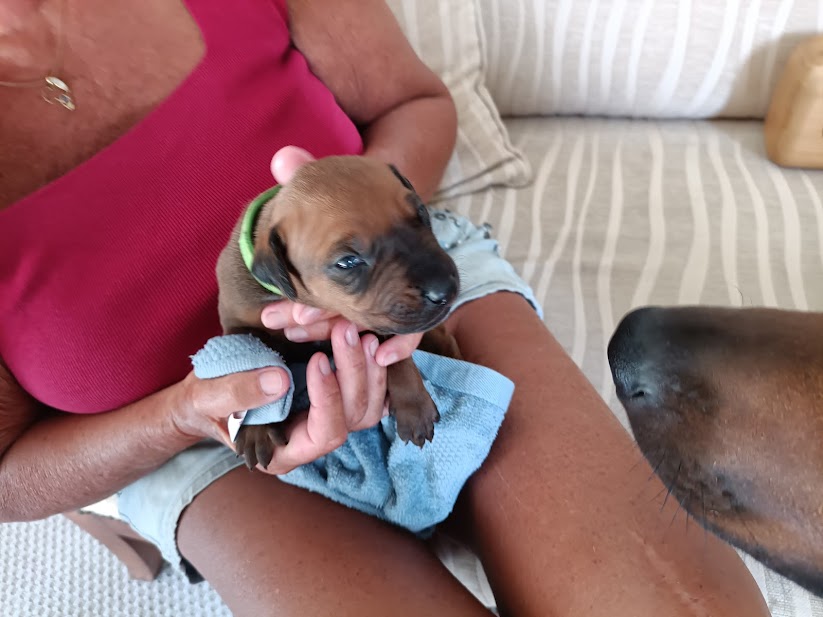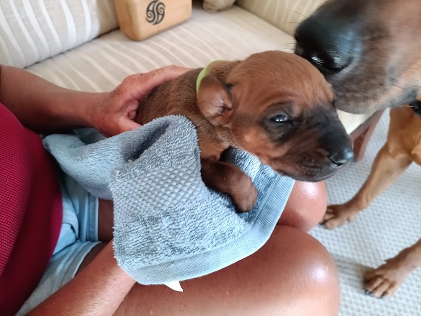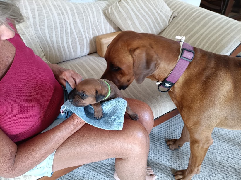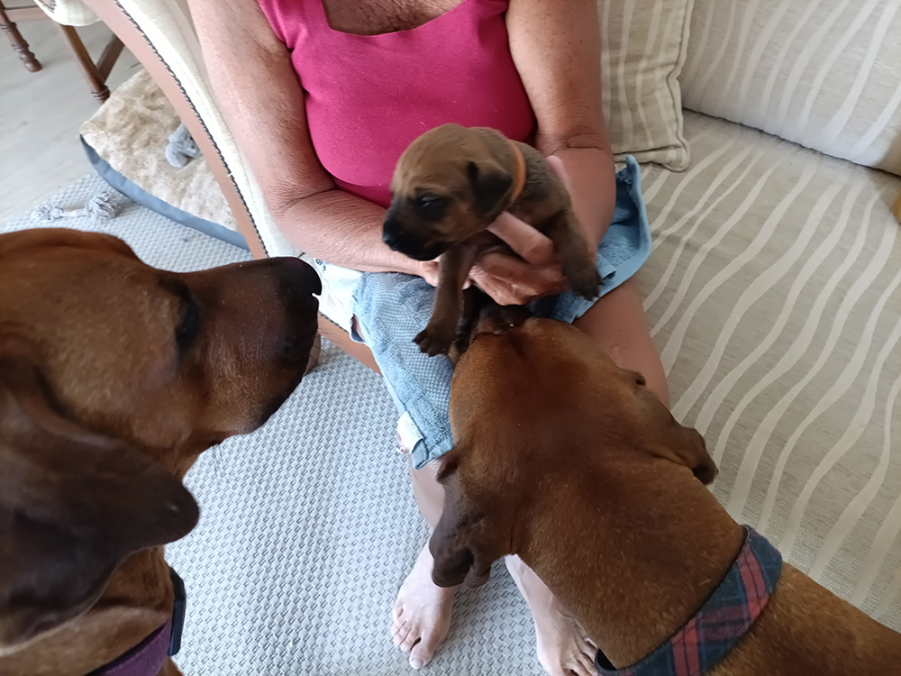 We look forward to their progress. They already like to fall asleep in your lap and, daddy Angus is showing a great interest in his progeny, once they are away from the whelping box and sitting with us in the next room. He was fascinated yesterday to see his baby in front of him and very gently licked it’s face and ears. Poppy was in attendance but then lay down beside us, trusting her mate, not to hurt their precious babies. It will be interesting to see the father-child relationship develop over the next few weeks.