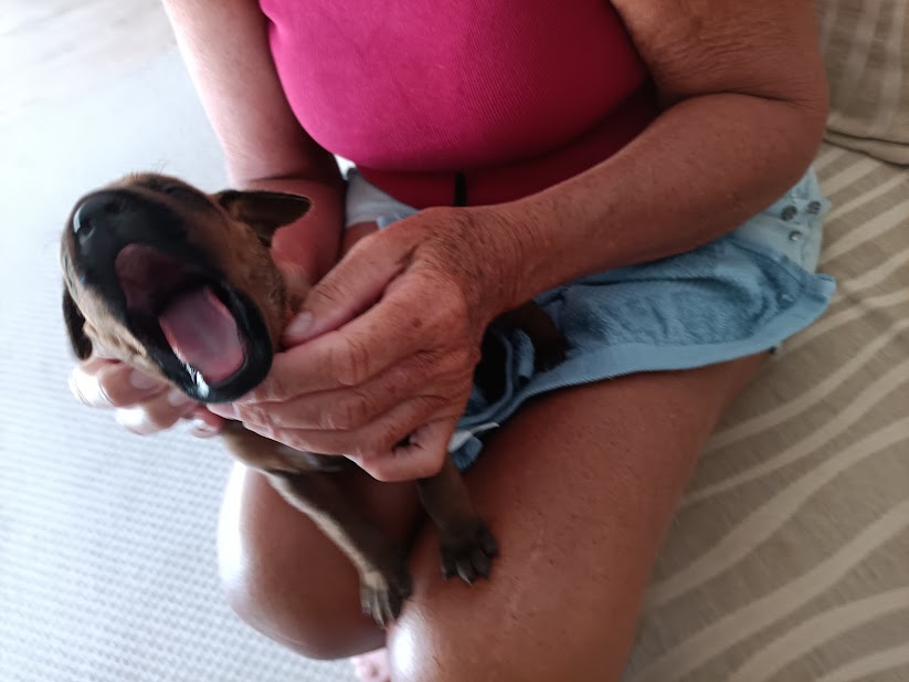 The puppies are two weeks old today! Number 13, Mr T, was the first to open his eyes, two days ago, closely followed by Miss Black, firstborn. They look so adorable, looking at you with those big brown eyes. Mr T is very happy to be held and licks your face, lovingly. The rest of the puppies are slowly catching up. There are only two who’s eyes haven’t yet opened. Their ear canals should be opening around now also, in time to explore their exciting new world and, hear all the lovely sounds of nature!