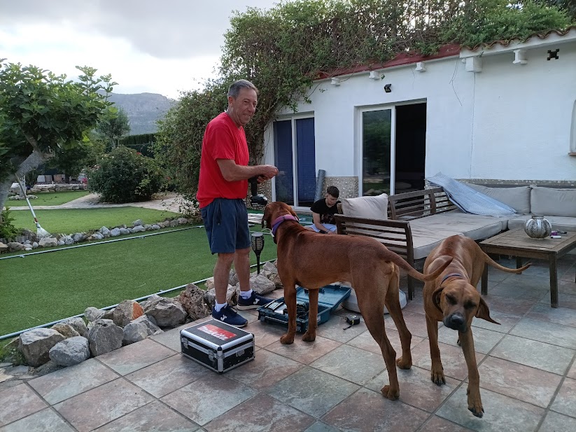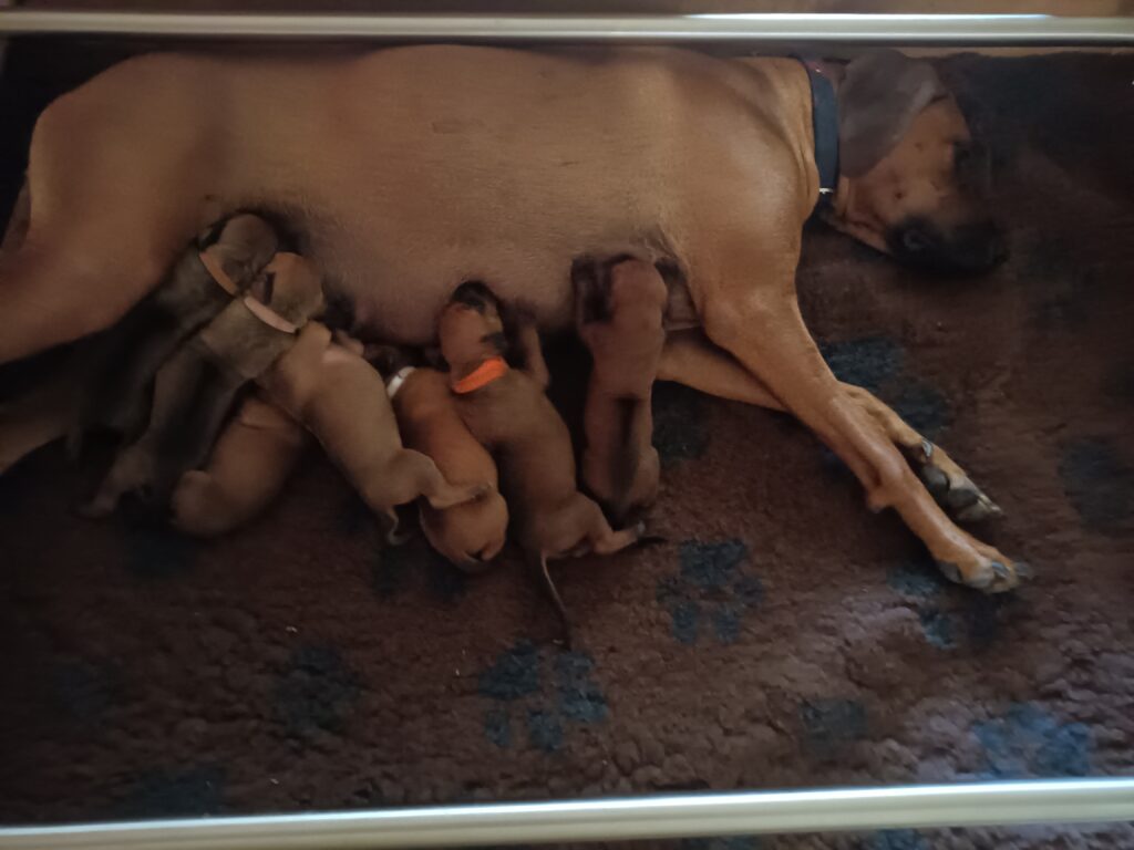 In preparation for when the puppies are walking and running, exploring their new surroundings, we have erected our huge, outdoor 6 x 3 metre playpen. It will provide a super exercise ground for the growing Ridgebacks, with stimulating toys, including a tunnel, playpen with balls, balancing table and, lots of ropes and toys to pull between each other! It’s nice and shaded and, they will learn to toilet train in a designated area as dogs do not like soiling their living space.